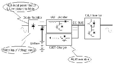 新型全IGBT UPS結構(高頻機)如下,基本結構:不控整流+DC/DC倍壓環(huán)節(jié)+獨立充電器+逆變器
